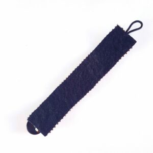 – Fermeture : bouton brodé avec pression cousue, protection par verni