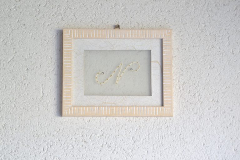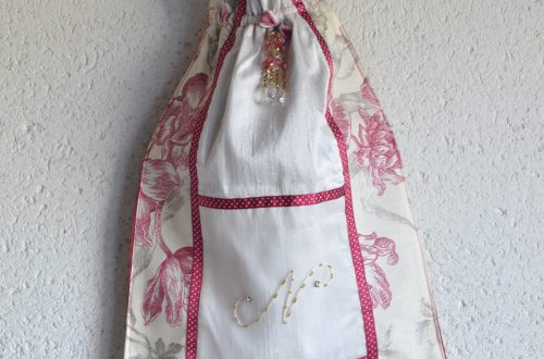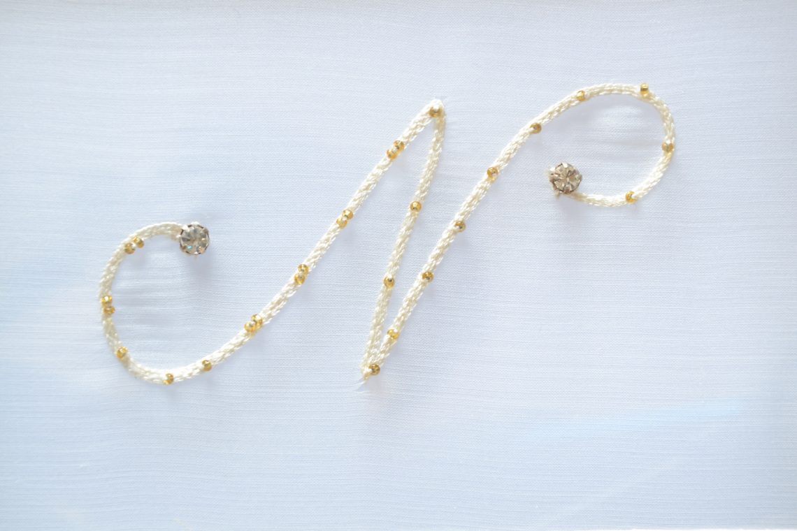 Vous repartirez avec une initiale sur organza de soie blanc brodée au fils de soie ou de coton suivant aptitudes ornée de perles dorées et cristal de Swarovski.